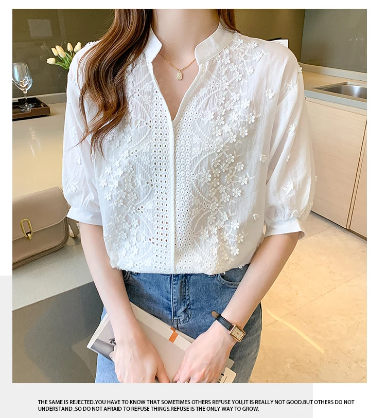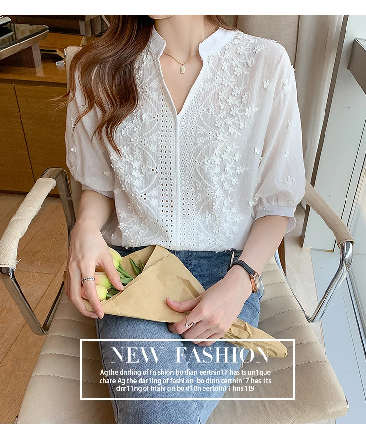 Embroidered Cotton Tops Half Sleeve V-neck Blouse