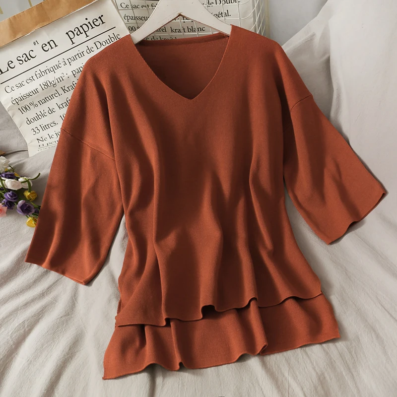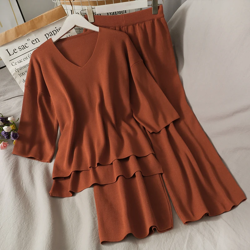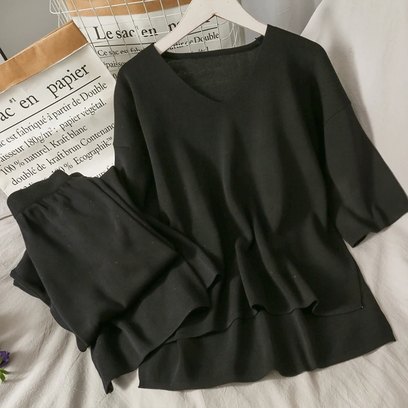 V-neck Half-sleeve Loose Knitted Sweater Elastic Waist Thin Drape Wide Leg Pants Set